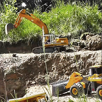 Camiones, retroexcavadora, minicargadoras con accesorios y compactadores de suelo. |